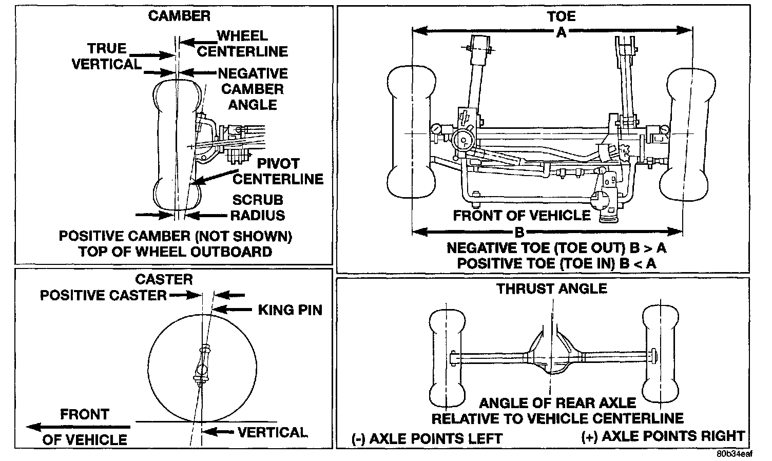 THRUST ANGLE - is the angle of the rear axle relative to the centerline of the vehicle. Incorrect thrust angle can cause off-center steering and excessive tire wear. This angle is not adjustable, damaged component(s) must be replaced to correct the thrust angle.