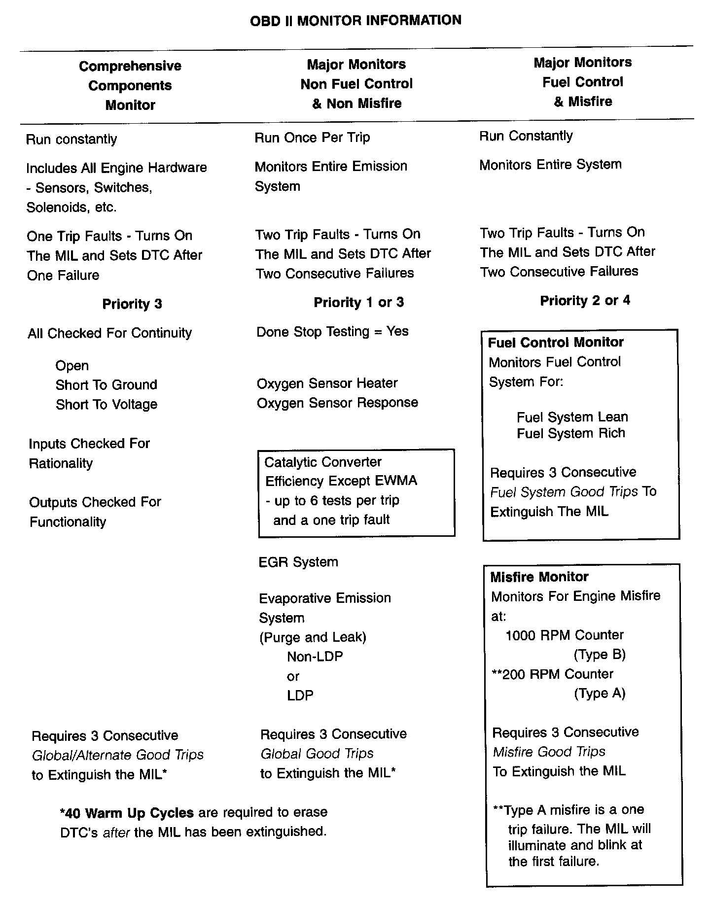 The table above summarizes the various OBDII monitors operation.