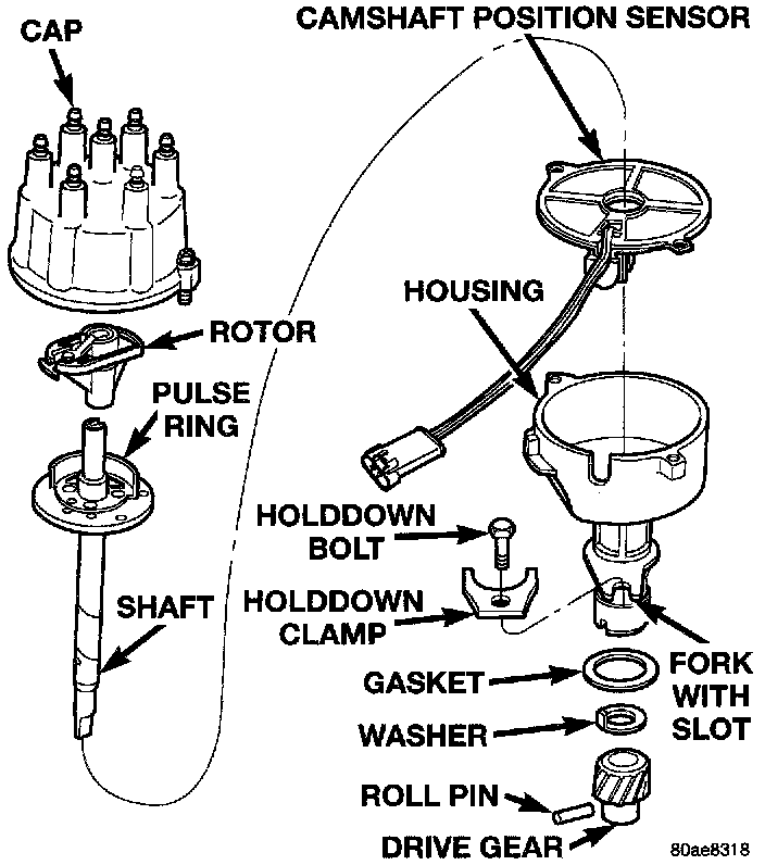 A fork with a slot is supplied on the bottom of the distributor housing where the housing base seats against the engine block. The centerline of the slot aligns with the distributor holddown bolt hole in the engine block. Because of the fork, the distributor cannot be rotated. Distributor rotation is not necessary as all ignition timing requirements are handled by the Powertrain Control Module (PCM).