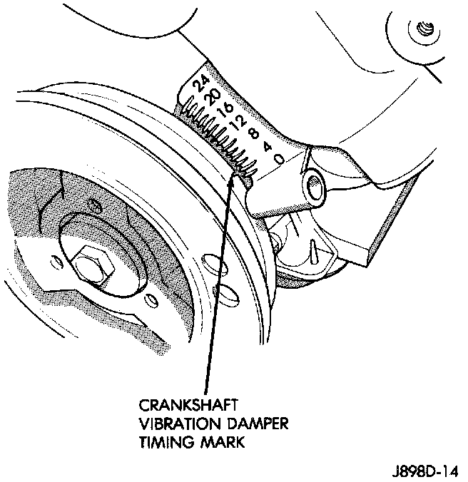 7. Slowly continue to rotate engine. Do this until timing index mark on vibration damper pulley aligns with top dead center (TDC) mark (0 degree) on timing degree scale. Always rotate engine in direction of normal rotation. Do not rotate engine backward to align timing marks.