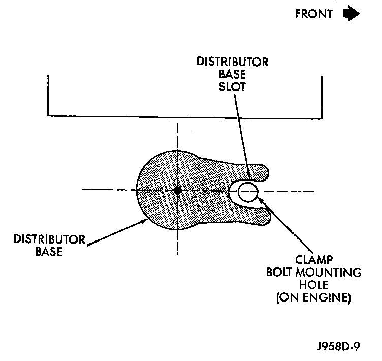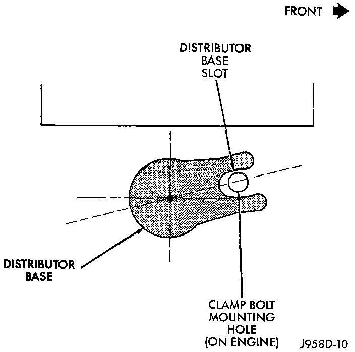 - centerline of slot at base of distributor is aligned to centerline of distributor holddown bolt hole on engine. In this position, the holddown bolt should easily pass through slot and into engine.