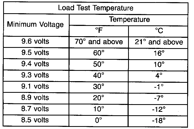 6. The voltage drop will vary with the battery temperature at the time of the load test. The battery temperature can be estimated by using the ambient temperature during the past several hours. If the battery has been charged, boosted, or loaded a few minutes prior to the test, the battery will be somewhat warmer. See the Load Test Temperature chart for the proper loaded voltage reading.