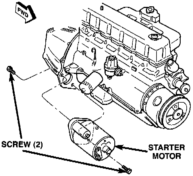 5. Position the starter motor to the front of the transmission clutch housing or torque converter housing and loosely install both the upper and lower mounting screws.