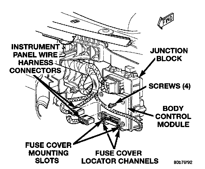 Instrument Panel Wire Harness Connectors, Junction Block, Screws(4), Body Control Module, Fuse Cover Locator Channels, Fuse Cover Mounting Slots: