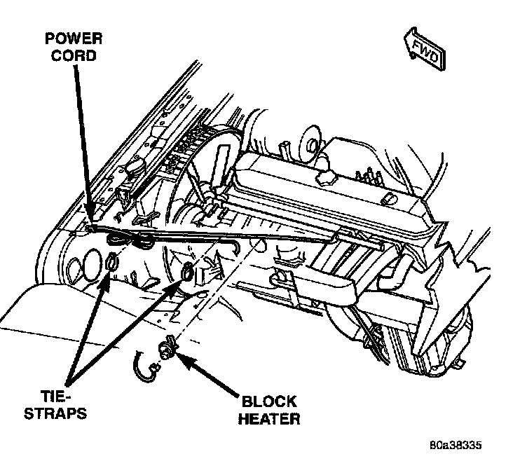 (5) Plug power cord into block heater. Route cord away from moving parts, linkages and exhaust system components. Secure cord in place with tie-straps.