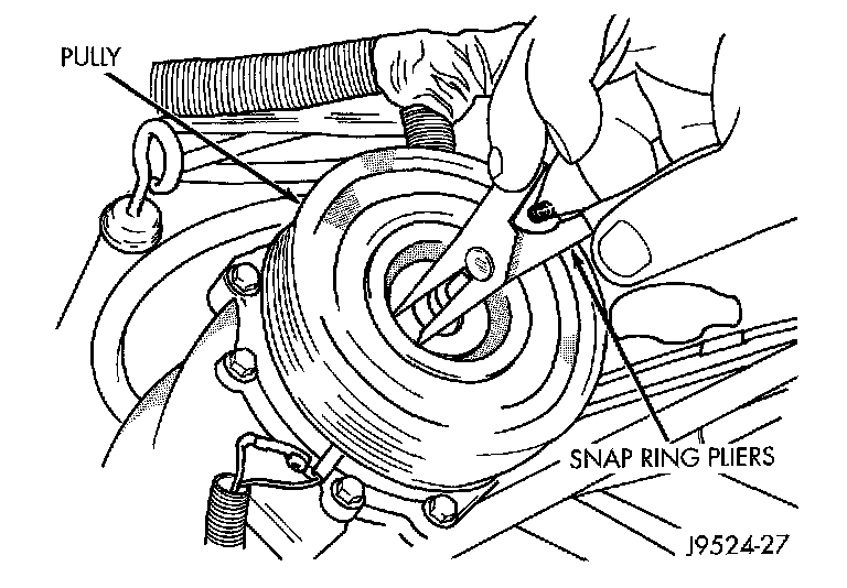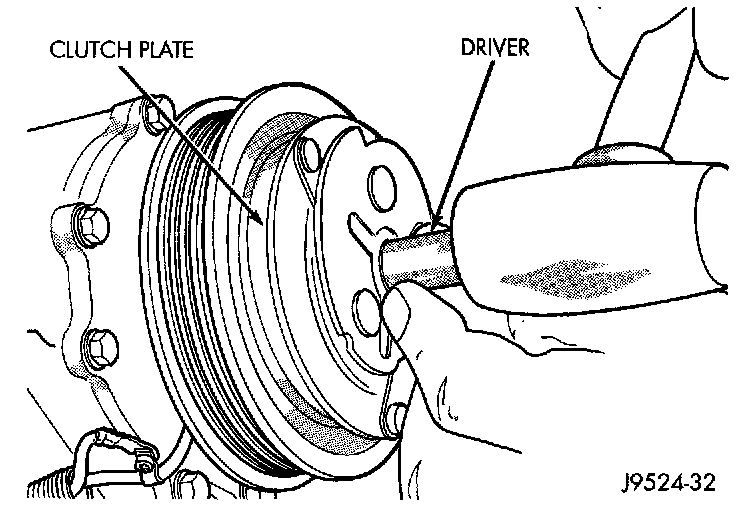 Examine the friction surfaces of the clutch pulley and the front plate for wear. The pulley and front plate should be replaced if there is excessive wear or scoring.