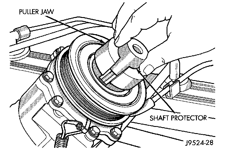 11. Install the puller through-bolts (Special Tool C-6461) through the puller flange and into the jaws of the rotor puller and tighten. Turn the puller center bolt clockwise until the rotor pulley is free.