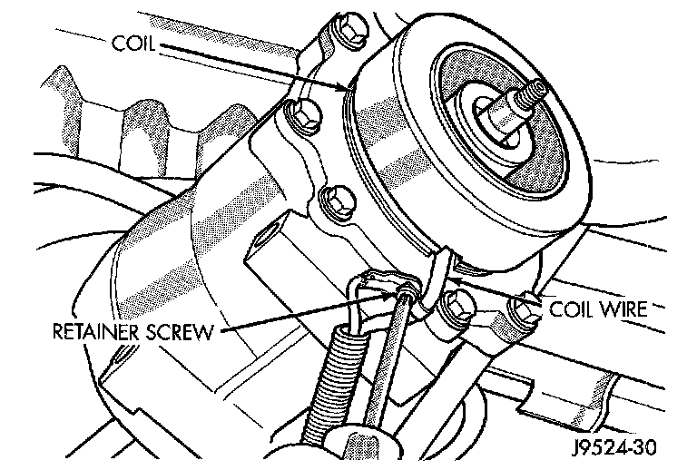 12. Remove the screw and retainer from the clutch coil lead wire harness on the compressor front housing.