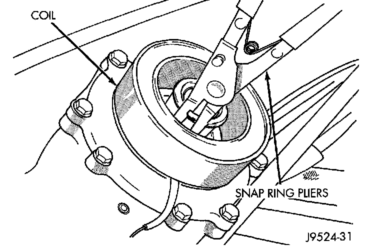13. Remove the snap ring from the compressor hub and remove the clutch field coil. Slide the clutch field coil off of the compressor hub.