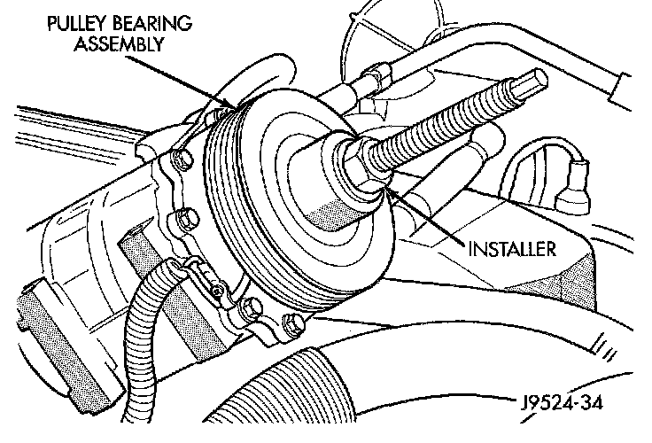 4. Install the pulley bearing assembly with the installer (Special Tool C-6871). Thread the installer on the shaft then turn the nut until the pulley assembly is seated.