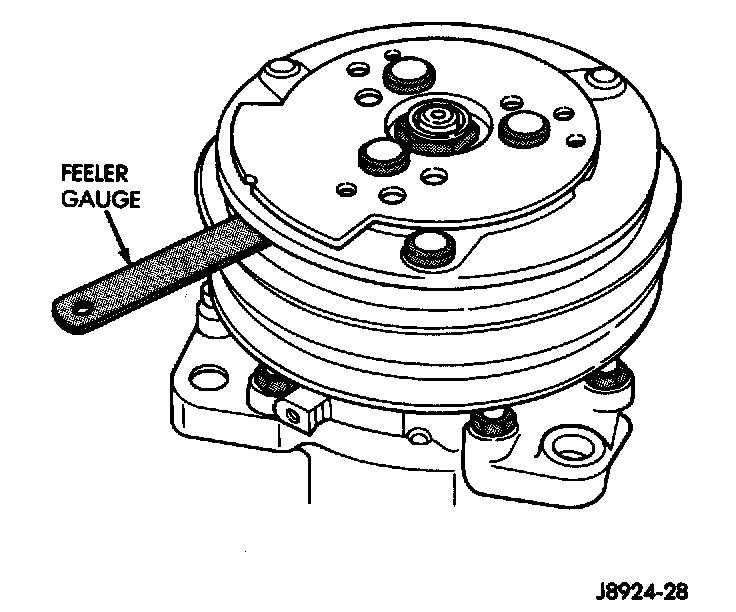 NOTE: The air gap is determined by the spacer shims. When installing an original, or a new clutch assembly, try the original shims first. When installing a new clutch onto a compressor that previously did not have a clutch, use 1.0, 0.50, and 0.13 millimeter (0.040, 0.020, and 0.005 inch) shims from the clutch hardware package that is provided with the new clutch.