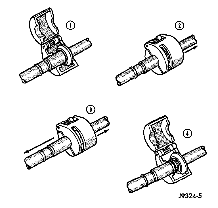 6. Push together firmly on the two halves of the coupler fitting until the garter spring in the cage on the male half of the fitting snaps over the flanged end on the female half of the fitting.