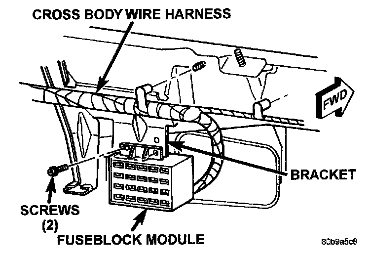 The fuseblock module is serviced as a unit with the cross body wire harness. If any internal circuit of the fuseblock module if the fuseblock module housing is faulty or damaged, the entire fuseblock module and the cross body wire harness unit must be replaced.WARNING: ON VEHICLES EQUIPPED WITH AIR-BAGS, REFER TO AIRBAG AND SEAT BELTS/AIR BAGS BEFORE ATTEMPTING ANY STEERING WHEEL, STEERING COLUMN, OR INSTRUMENT PANEL COMPONENT DIAGNOSIS OR SERVICE. FAILURE TO TAKE THE PROPER PRECAUTIONS COULD RESULT IN ACCIDENTAL AIR-BAG DEPLOYMENT AND POSSIBLE PERSONAL INJURY.