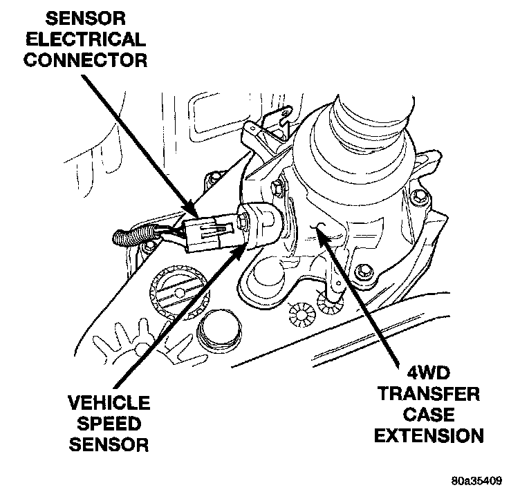 The vehicle speed sensor is located on the speedometer pinion gear adapter. The pinion gear adapter is located on the transfer case extension (driver side).