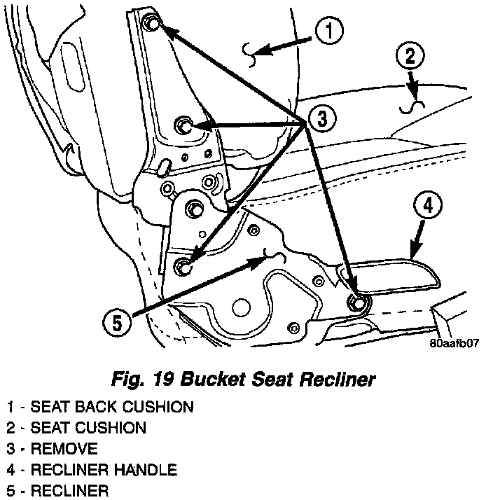 4. Remove bolts attaching recliner to seatback and seat cushion frames (Fig. 19).