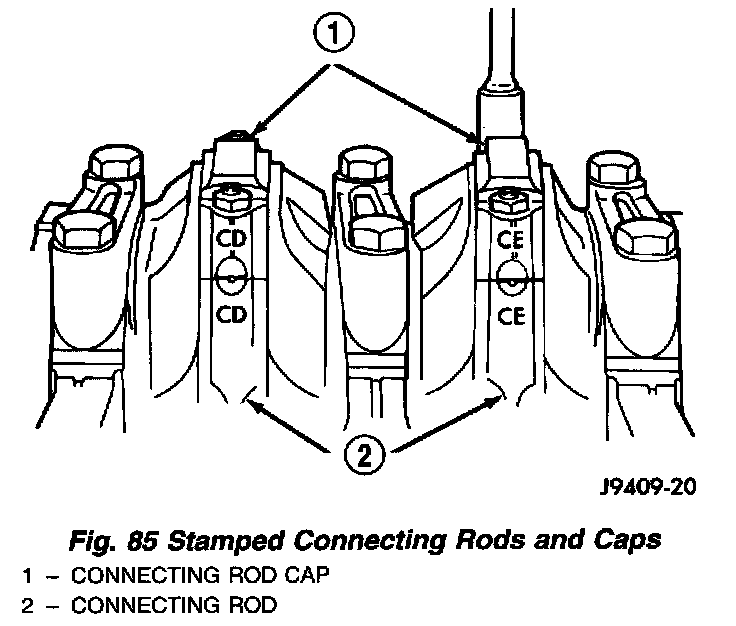 9. Remove the connecting rod bearing caps and inserts. Mark the caps and rods with the cylinder bore location. The connecting rods and caps are stamped with a two letter combination (Fig. 85).