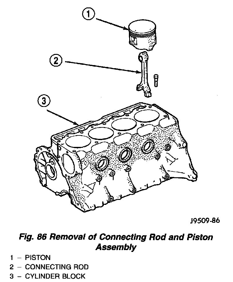 11. Have an assistant push the piston and connecting rod assemblies up and through the top of the cylinder bores (Fig. 86).