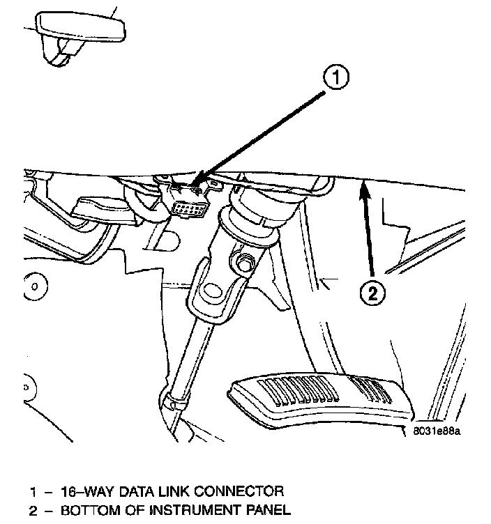 1. Connect the DRB scan tool to the 16-way data link wire harness connector. The connector is located on the driver side lower edge of the instrument panel, outboard of the steering column.