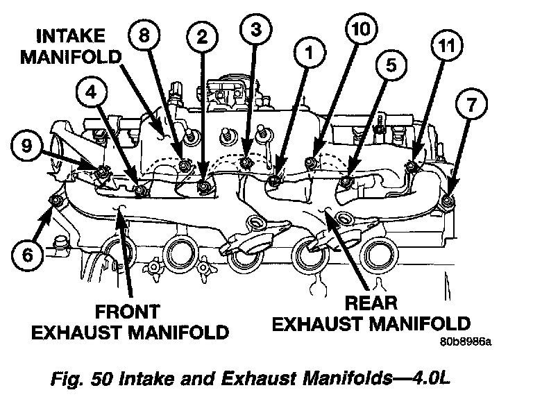 The intake and engine exhaust manifolds on the 4.0L engine must be removed and installed together. The manifolds use a common gasket at the cylinder head.