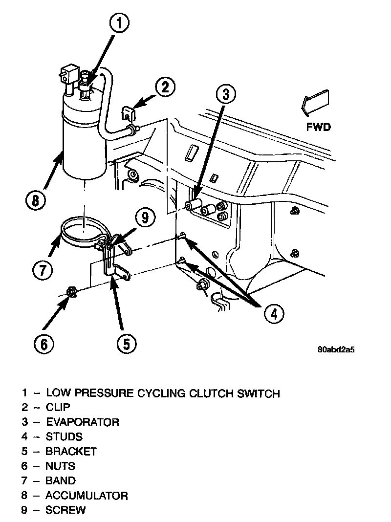 7. Pull the accumulator and retaining band unit forward until the screw in the band is clear of the slotted hole in the support bracket on the dash panel.
