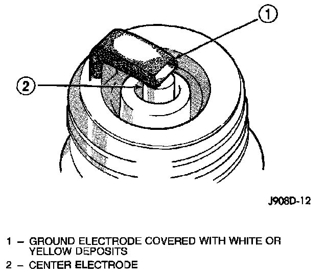 Fuel scavenger deposits may be either white or yellow. They may appear to be harmful, but this is a normal condition caused by chemical additives in certain fuels. These additives are designed to change the chemical nature of deposits and decrease spark plug misfire tendencies. Notice that accumulation on the ground electrode and shell area may be heavy, but the deposits are easily removed. Spark plugs with scavenger deposits can be considered normal in condition and can he cleaned using standard procedures.