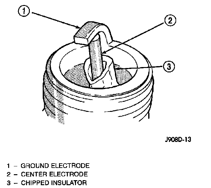 A chipped electrode insulator usually results from bending the center electrode while adjusting the spark plug electrode gap. Under certain conditions,severe detonation can also separate the insulator from the center electrode. Spark plugs with this condition must be replaced.