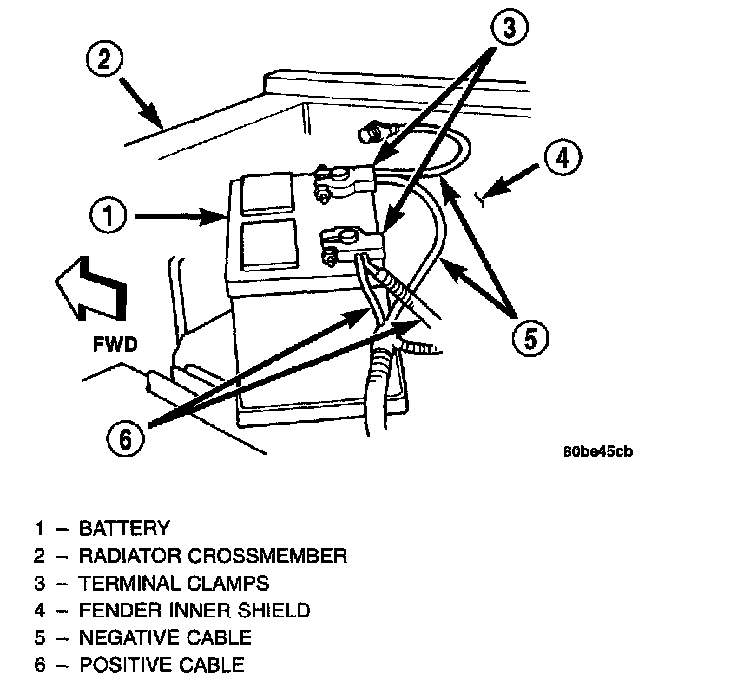 The battery positive cable terminal clamp is die cast onto the ends of two wires. One wire has an eye- let terminal that connects the battery positive cable to the B(+) terminal stud of the Power Distribution Center (PDC), and the other wire has an eyelet terminal that connects the battery positive cable to the B(+) terminal stud of the engine starter motor solenoid. The battery negative cable terminal clamp is also die cast onto the ends of two wires. One wire has an eyelet terminal that connects the battery negative cable to the vehicle powertrain through a stud on the right side of the engine block. The other wire has an eyelet terminal that connects the battery negative cable to the vehicle body through a ground screw on the right front fender inner shield, near the battery.