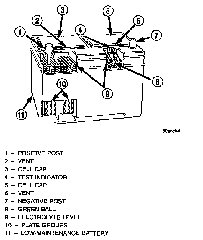 This battery is designed to provide a safe, efficient and reliable means of storing electrical energy in a chemical form. This means of energy storage allows the battery to produce the electrical energy required to operate the engine starting system, as well as to operate many of the other vehicle accessory systems for limited durations while the engine and/or the charging system are not operating. The battery is made up of six individual cells that are connected in series. Each cell contains positively charged plate groups that are connected with lead straps to the positive terminal post, and negatively charged plate groups that are connected with lead straps to the negative terminal post. Each plate consists of a stiff mesh framework or grid coated with lead dioxide (positive plate) or sponge lead (negative plate). Insulators or plate separators made of a non-conductive material are inserted between the positive and negative plates to prevent them from contacting or shorting against one another. These dissimilar metal plates are submerged in a sulfuric acid and water solution called an electrolyte.