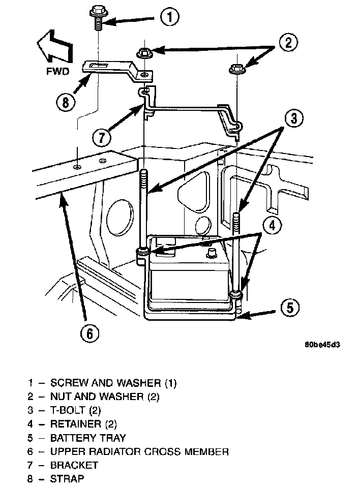 The battery hold down hardware secures the battery to the battery tray in the engine compartment. The hold down support strap provides an additional anchor point for the upper end of the battery and hold down hardware at the upper radiator crossmember. This hardware is designed to prevent battery movement during vehicle operation. Unrestrained battery movement during vehicle operation can result in damage to the vehicle, the battery or both.