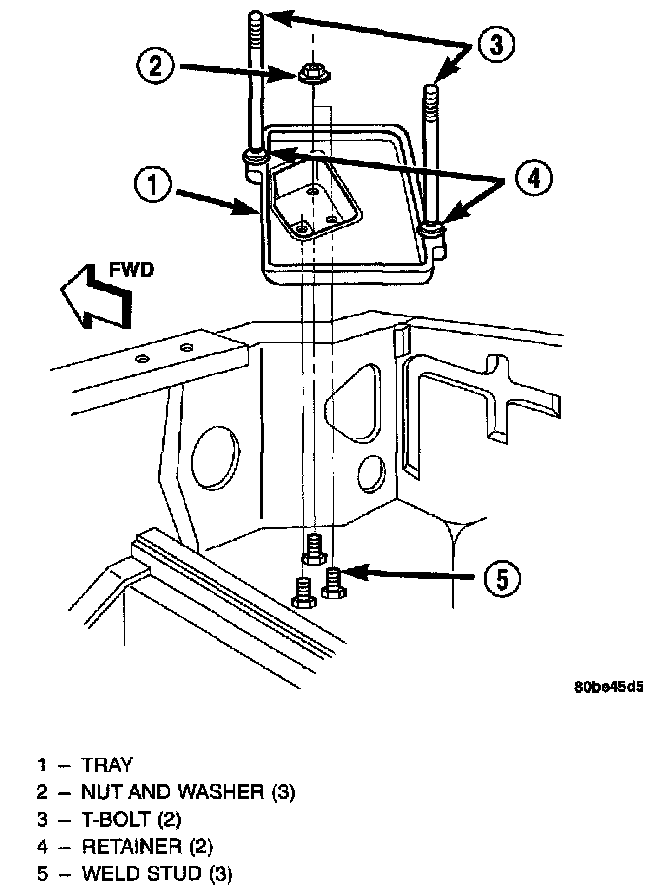 The hold down T-bolts are installed onto the battery tray before the tray is installed in the engine compartment. The T-bolts are inserted through a hole in a molded formation integral to each side of the battery tray from underneath, with the threaded ends of the bolts extending upward. A plastic push-on retainer is installed over each T-bolt to secure the T-bolts to the battery tray for ease of assembly during the vehicle manufacturing process. However, these plastic push-on retainers are not available or required for service replacement.