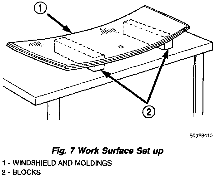 9. Position the windshield inside up on a suitable work surface with two padded, wood 10 cm by 10 cm by 50 cm (4 in. by 4 in. by 20 in.) blocks, placed parallel 75 cm (2.5 ft.) apart (Fig. 7).