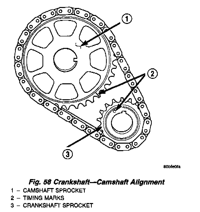 3. To verify correct installation of the timing chain, rotate the crankshaft 2 revolutions. The camshaft and crankshaft sprocket timing mark should align (Fig. 58).