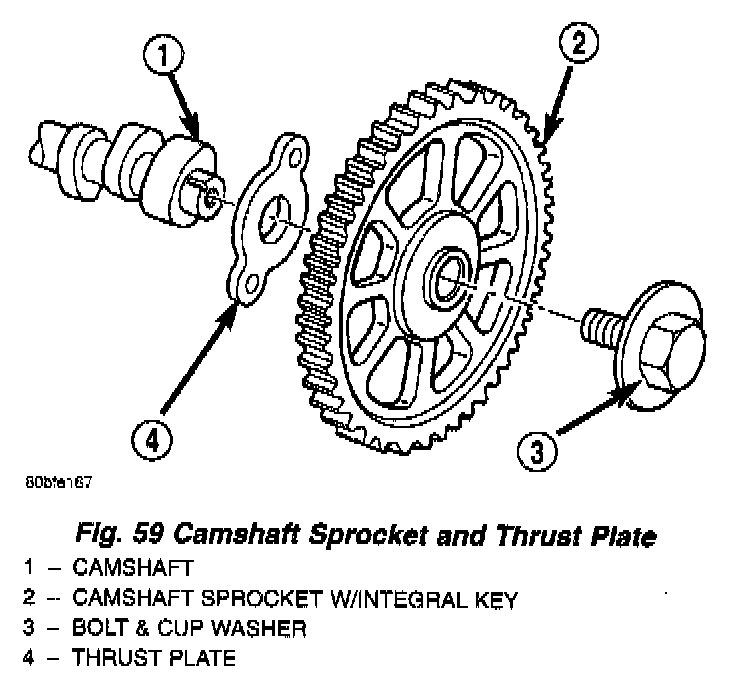 8. Remove the camshaft sprocket bolt and washer (Fig. 59).