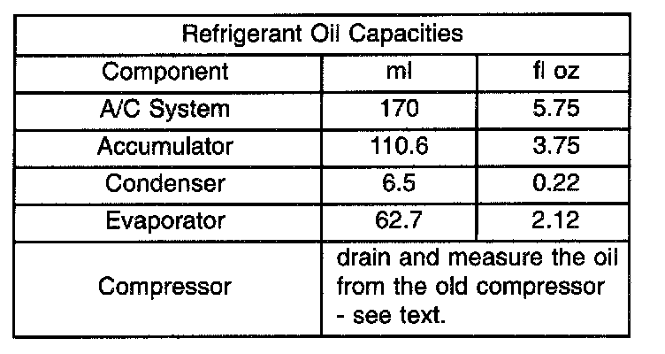 Refrigerant oil must be added when a accumulator, evaporator coil, or condenser are replaced. See the Refrigerant Oil Capacities chart. When a compressor is replaced, the refrigerant oil must be drained from the old compressor and measured. Drain all of the refrigerant oil from the new compressor, then fill the new compressor with the same amount of refrigerant oil that was drained out of the old compressor.
