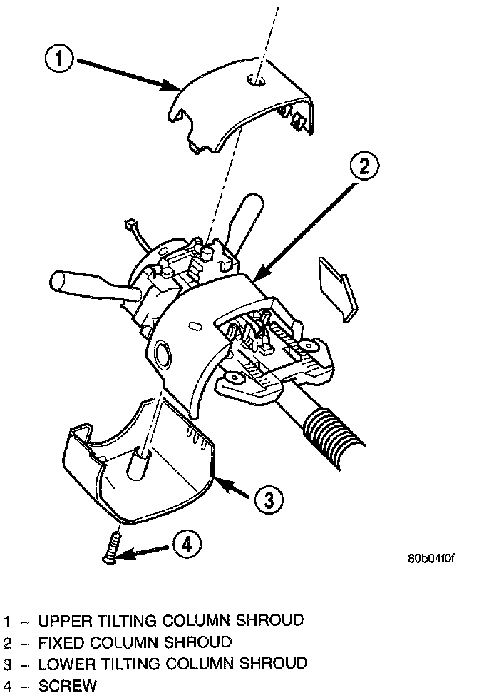 2. Remove the screw that secures the lower tilting steering column shroud to the steering column multi-function switch mounting housing.
