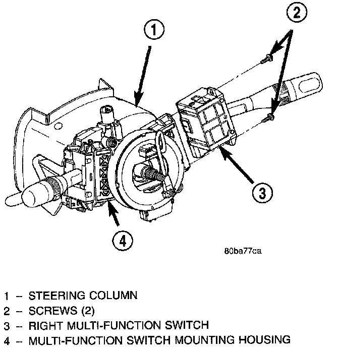 5. Remove the two screws that secure the right multi-function switch to the multi-function switch mounting housing.