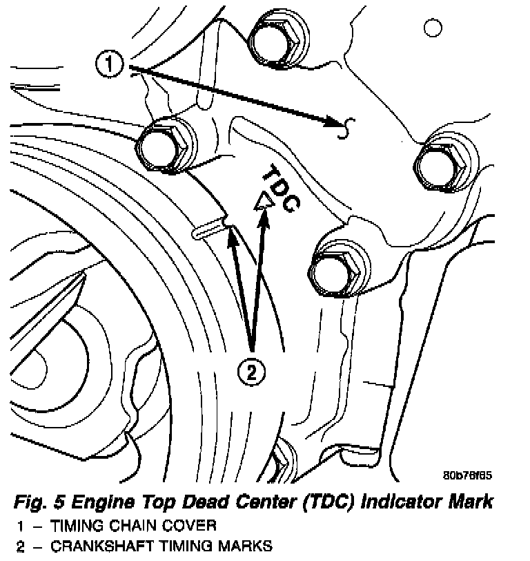 2. Using a mirror, locate the TDC arrow on the front cover (Fig. 5). Rotate the crankshaft until the mark on the crankshaft damper is aligned with the TDC arrow on the front cover. The engine is now at TDC.