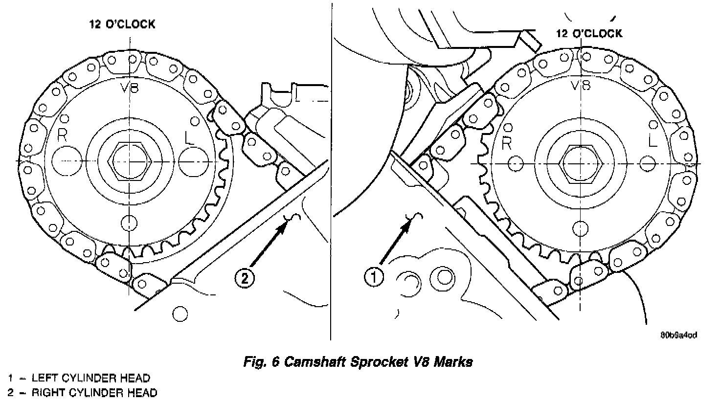 3. Note the location of the V8 mark stamped into the camshaft drive gears (Fig. 6). If the V8 mark on each camshaft drive gear is at the twelve o'clock position, the engine is at TDC on the exhaust stroke. If the V8 mark on each gear is at the six o'clock position, the engine is at TDC on the compression stroke.