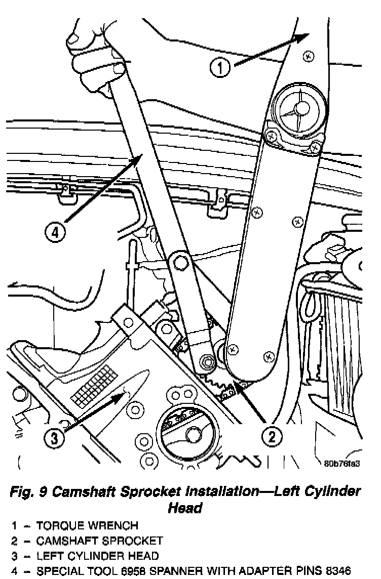 6. Position the camshaft drive gear onto the camshaft, remove oil from bolt then install the retaining bolt. Using Special Tools, Spanner Wrench 6958 with Adapter Pins 8346 and a suitable torque wrench, Tighten retaining bolt to 122 Nm (90 ft. Lbs.) (Fig. 9) (Fig. 10).