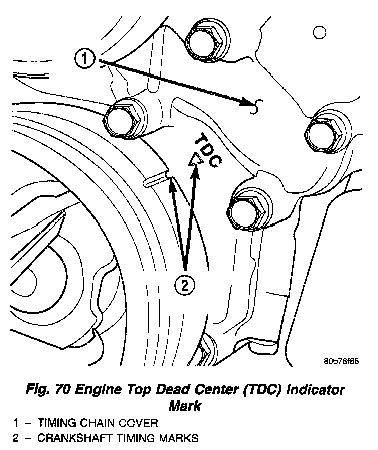 5. Rotate engine until timing mark on crankshaft damper aligns with TDC mark on timing chain cover (Fig. 70) (#1 cylinder exhaust stroke) and the camshaft sprocket "V8" marks are at the 12 o'clock position (Fig. 71).