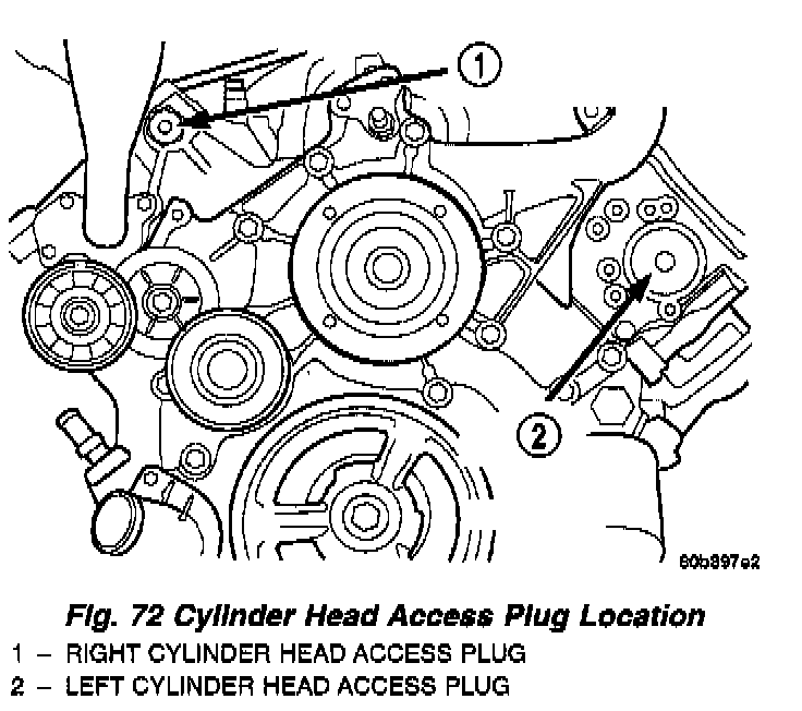 7. Remove access plugs (2) from left and right cylinder heads for access to chain guide fasteners (Fig. 72).