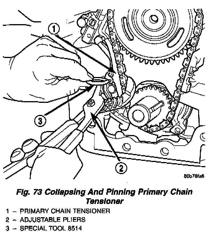 10. Collapse and pin primary chain tensioner (Fig. 73).