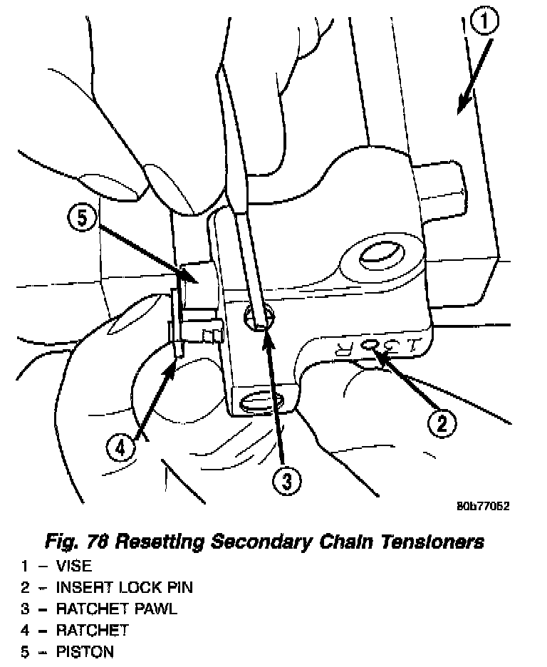 1. Using a vise, lightly compress the secondary chain tensioner piston until the piston step is flush with the tensioner body. Using a pin or suitable tool, release ratchet pawl by pulling pawl back against spring force through access hole on side of tensioner. While continuing to hold pawl back, Push ratchet device to approximately 2 mm from the tensioner body. Install Special Tool 8514 lock pin into hole on front of tensioner. Slowly open vise to transfer piston spring force to lock pin (Fig. 78).