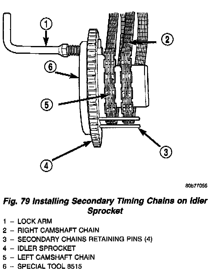 7. Install both secondary chains onto the idler sprocket. Align two plated links on the secondary chains to be visible through the two lower openings on the idler sprocket (4 o'clock and 8 o'clock). Once the secondary timing chains are installed, position special tool 8515 to hold chains in place for installation (Fig. 79).