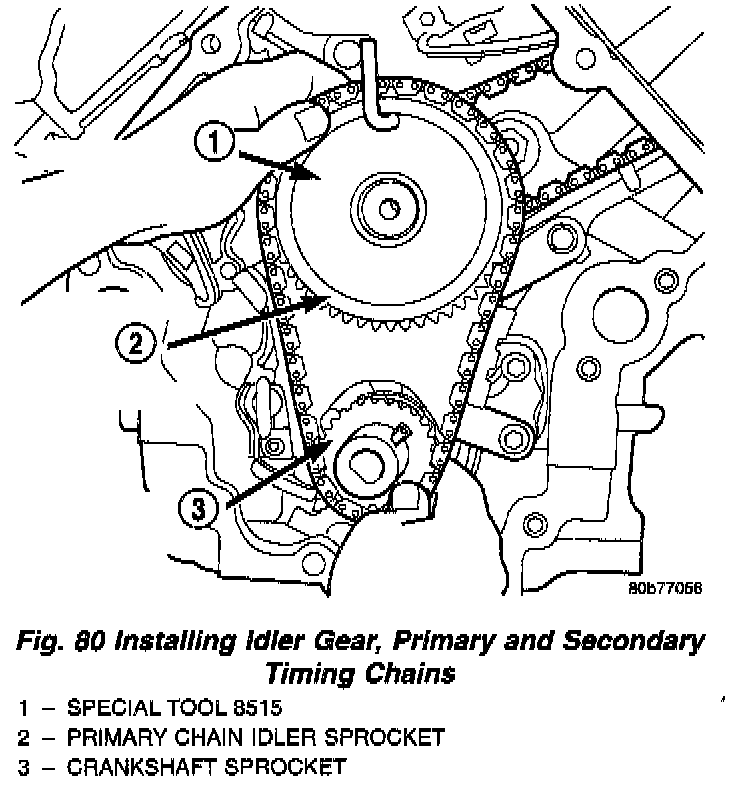 14. Verify that all plated links are aligned with the marks on all sprockets and the "8" marks on camshaft sprockets are at the 12 o'clock position (Fig. 77).
