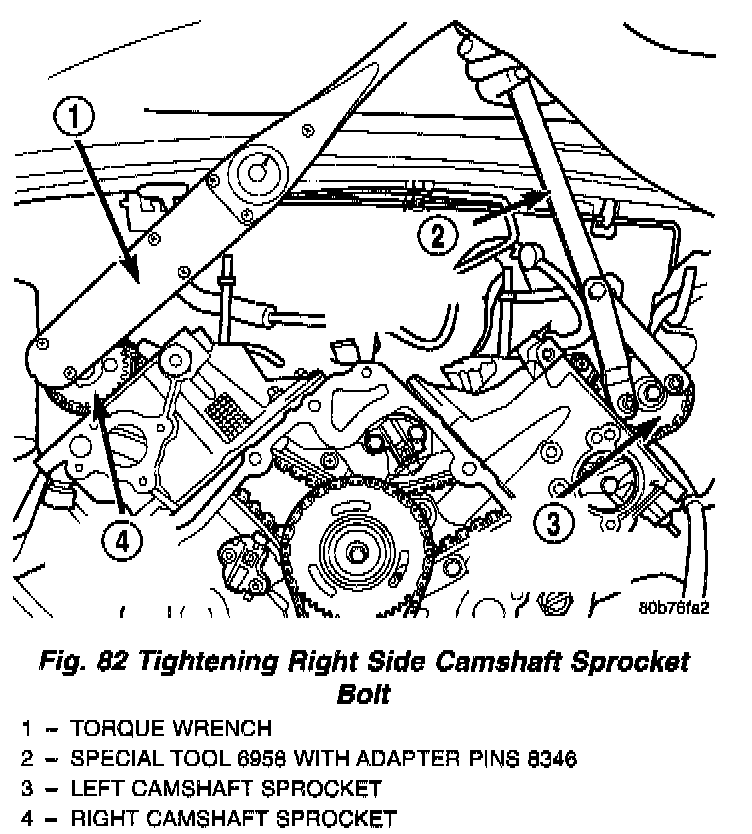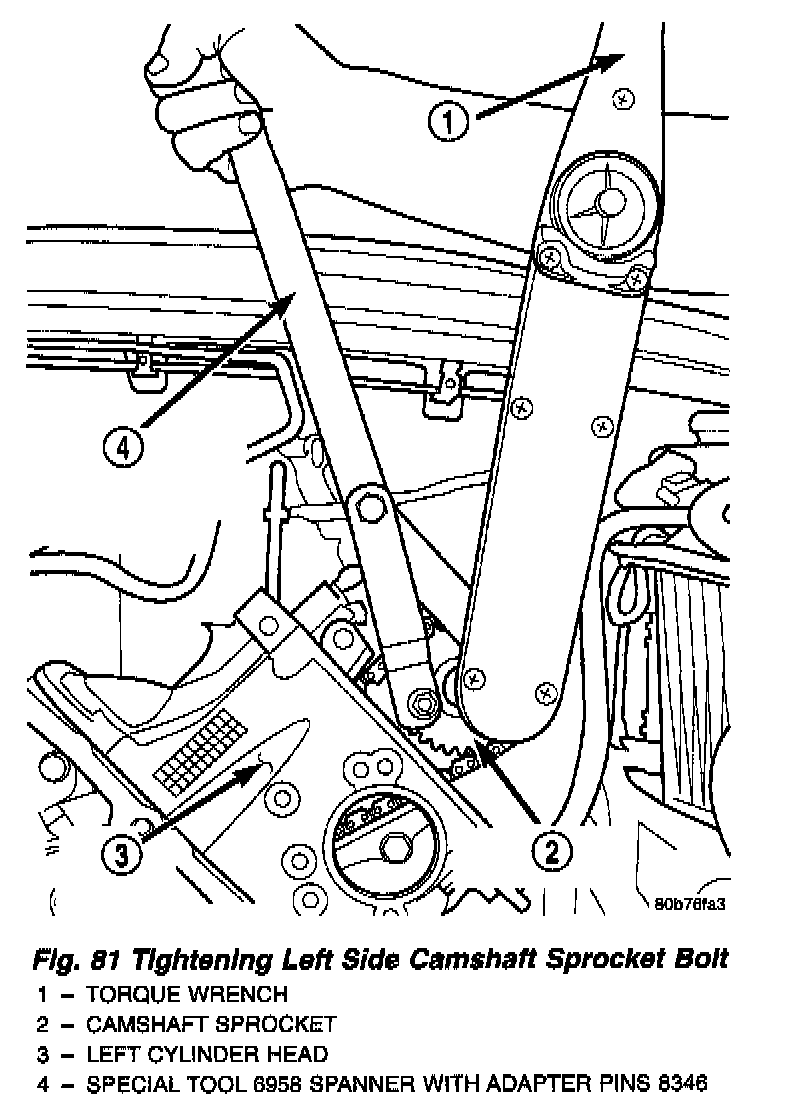 18. Using Special Tool 6958, Spanner with Adaptor Pins 8346, tighten left (Fig. 81) and right (Fig. 82). camshaft sprocket bolts to 122 Nm (90 ft. lbs.).