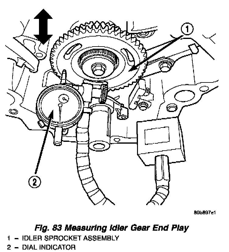 21. After installing all chains, it is recommended that the idler gear end play be checked (Fig. 83). The end play must be within 0.10 - 0.25 mm (0.004 - 0.010 inch). If not within specification, the idler gear must be replaced.