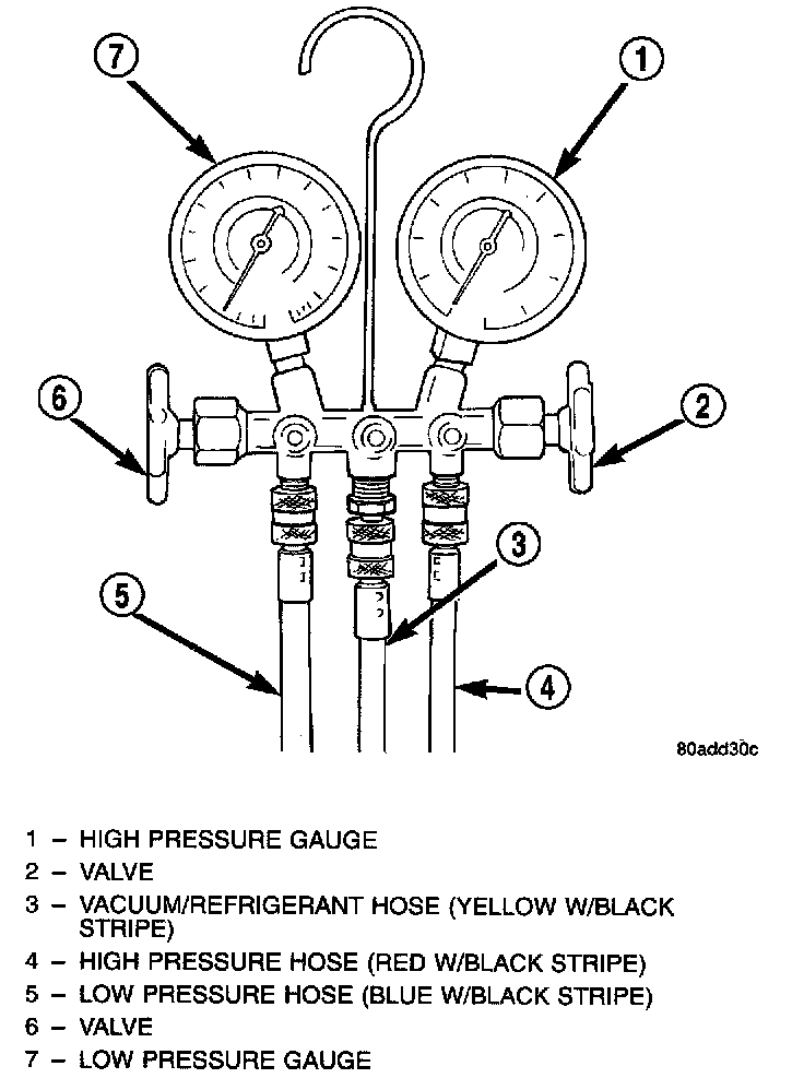A manifold gauge set may be needed with some recovery/recycling/charging equipment. The service hoses on the gauge set being used should have manual (turn wheel), or automatic back-flow valves at the service port connector ends. This will prevent refrigerant from being released into the atmosphere.