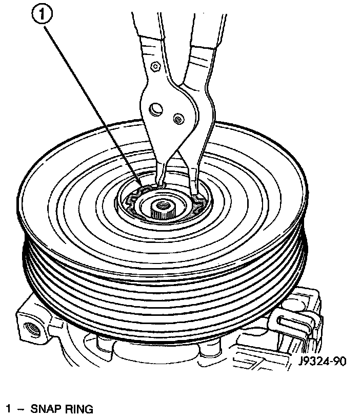 5. Remove the external snap ring that secures the compressor clutch pulley to the nose of the compressor front housing with snap ring pliers (Special Tool C-4574) and slide the pulley assembly off of the compressor.