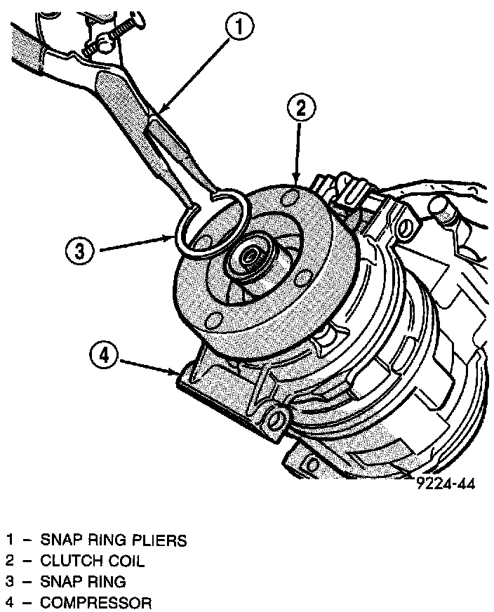 7. Remove the external snap ring that secures the compressor clutch coil to the nose of the compressor front housing with snap ring pliers and slide the coil assembly off of the compressor.